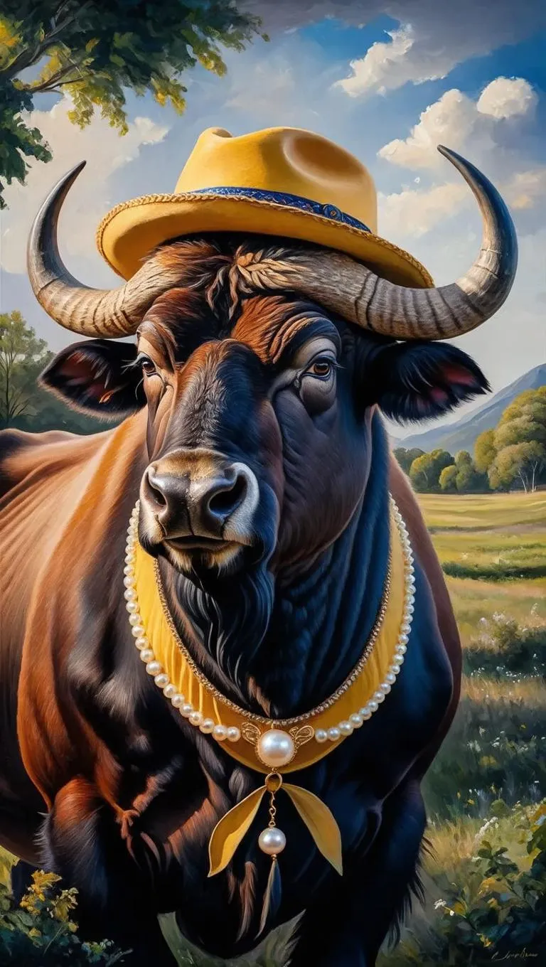 Create AI-generated art of a majestic buffalo with pearl earrings and a vibrant yellow collar in a lush, oil-painted landscape. Blend wild elegance and whimsical contrasts for captivating visuals. Perfect for AI image generation, transforming text prompts into professional-grade scenes with vivid details and artistic flair on vivago.ai.