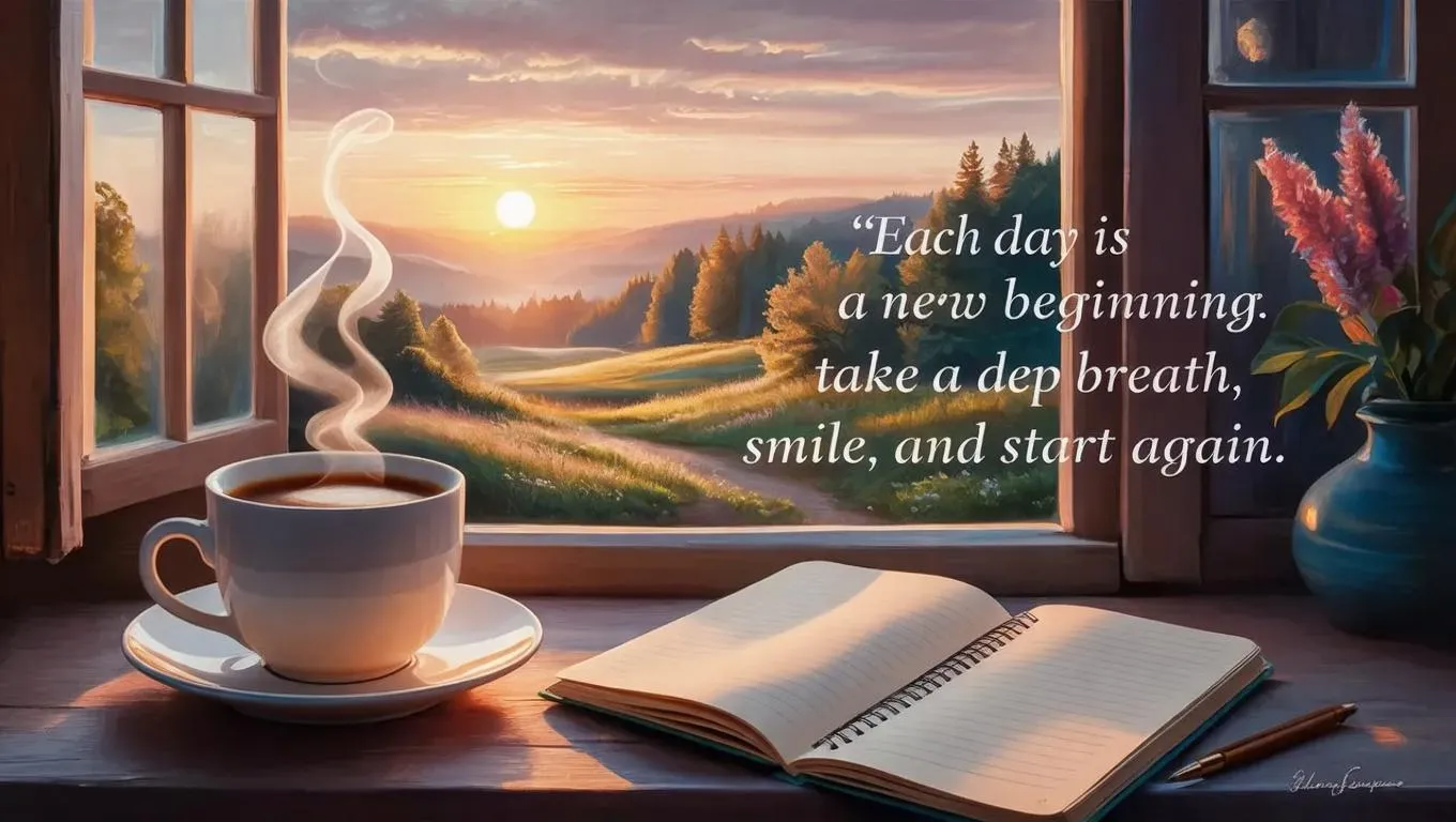 Create a serene AI-generated morning scene with a sunrise, peaceful landscape, cozy nook, steaming coffee, and inspirational quotes. Vivago.ai crafts calming visuals using warm color palettes for positivity. Transform text prompts into professional-grade images with AI effects, evoking tranquility and fresh beginnings in every detail.