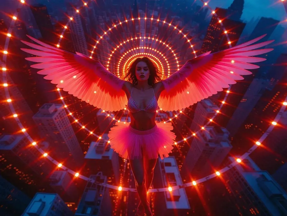 Generate stunning AI fashion photography with a surreal model floating over a futuristic cityscape. Featuring glowing gradient hearts, billowing playing card wings, and organic futurism style. Full-body low-angle shot captures legs in frame with trending ArtStation aesthetics. Create unconventional, heavenly fashion visuals using Vivago.ai's AI tools.