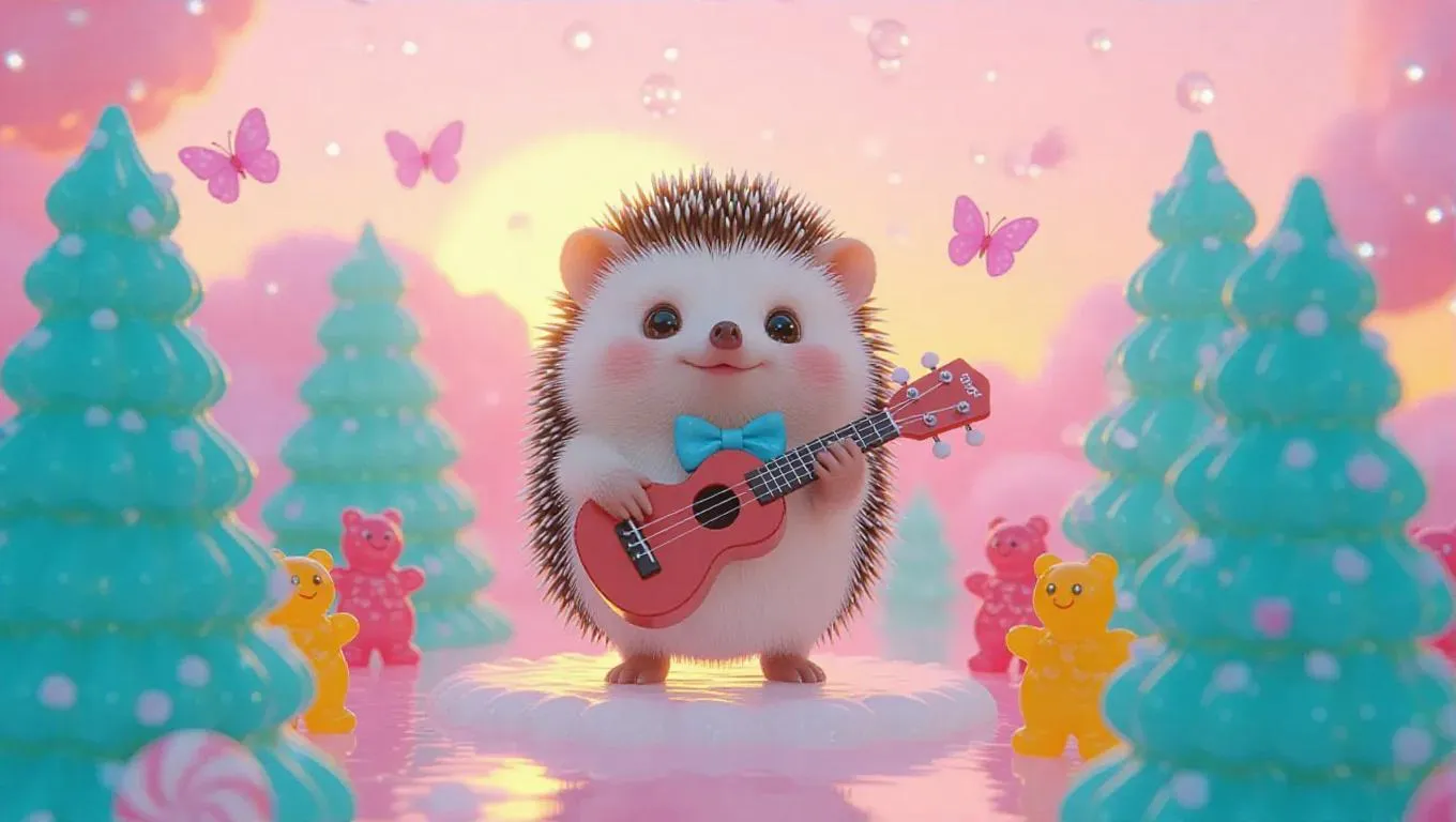 Dive into a whimsical AI-generated candy wonderland where a hedgehog musician strums a sugar-glass ukulele on a jellybean stage. Gummy bear singers, peppermint trees, and glitter rain create a vibrant edible fantasy. Perfect for AI art lovers seeking magical scenes with marshmallow charm, heart-shaped melodies, and candy-flutter effects. Transform prompts into surreal visuals with Vivago.ai's creative tools.