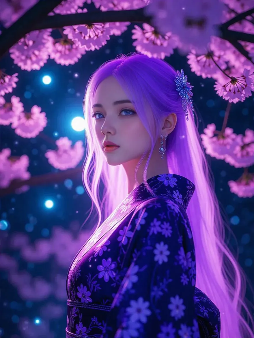 A serene, ethereal woman with flowing lavender hair and glowing violet eyes, wearing a futuristic, holographic kimono embedded with soft pulsing lights, standing beneath a bioluminescent cherry blossom tree in full bloom. The night sky above sparkles with stars and two glowing moons. Style of dreamy fantasy illustration, soft neon lighting, cinematic atmosphere, crystal-like texture, masterpiece