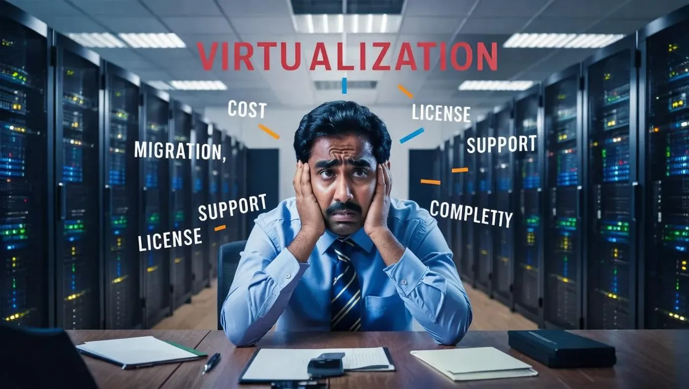 Struggling with **Virtualization** complexities? This AI-generated image depicts an anxious Indian corporate professional amidst office servers, highlighting challenges like cost, migration, licensing, and support. Optimize IT transitions effortlessly with vivago.ai’s AI tools for seamless virtualization solutions.
