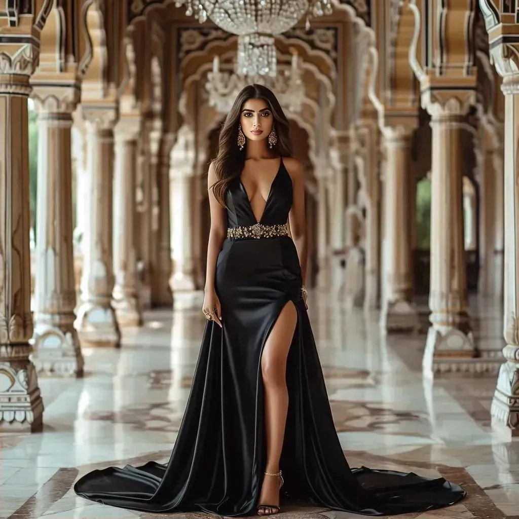 Generate stunning AI visuals of a tall Indian woman in a sleek black satin slit dress, elegantly posing in a grand hall. Perfect for fashion portfolios, digital art, or creative projects with Vivago.ai's AI image generator for professional-grade, lifelike results.