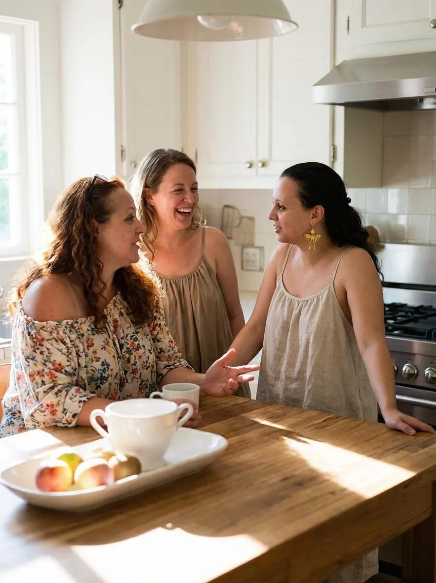 Create AI-generated close-up portraits of three women chatting at a kitchen table. Edit to remove glasses, adjust tiny summer clothes loose and falling off. Transform your vision into stunning visuals with vivago.ai's AI image tools.