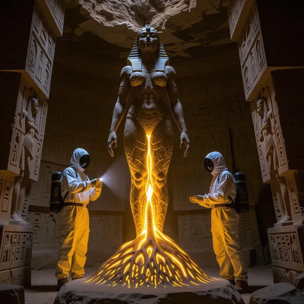 Uncover ancient mysteries with this AI-generated scene: a luminous humanoid statue with intricate bone-like patterns stands in an Egyptian-inspired crypt, roots glowing softly. Archaeologists in protective suits examine weathered hieroglyph-covered walls. Perfect for historical fantasy visuals, created via AI image tools for immersive storytelling, game design, or conceptual art. Explore ancient civilizations reimagined through cutting-edge AI artistry.