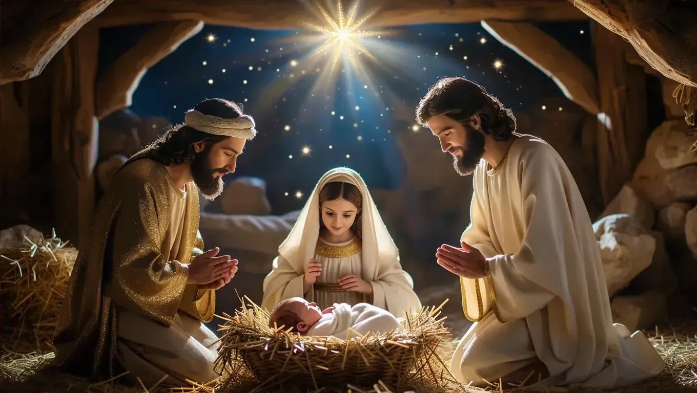 Create a divine nativity scene with AI-generated visuals of the Three Wise Men honoring baby Jesus, Mary weeping beside the cradle, and celestial light symbolizing God's kingdom. Perfect for religious content, Christmas storytelling, and spiritual imagery with professional AI effects.