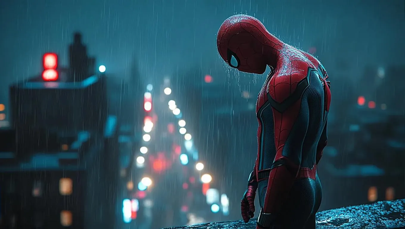 AI-generated image of Spider-Man in cinematic dramatic style: solitary figure on rain-soaked rooftop, muted blue-gray tones with faint city reflections. Somber mood, introspective scene blending AI effects for vivid solitude. Perfect for AI-powered visual storytelling, transforming text prompts into professional-grade cinematic visuals emphasizing isolation and rainy urban atmosphere.