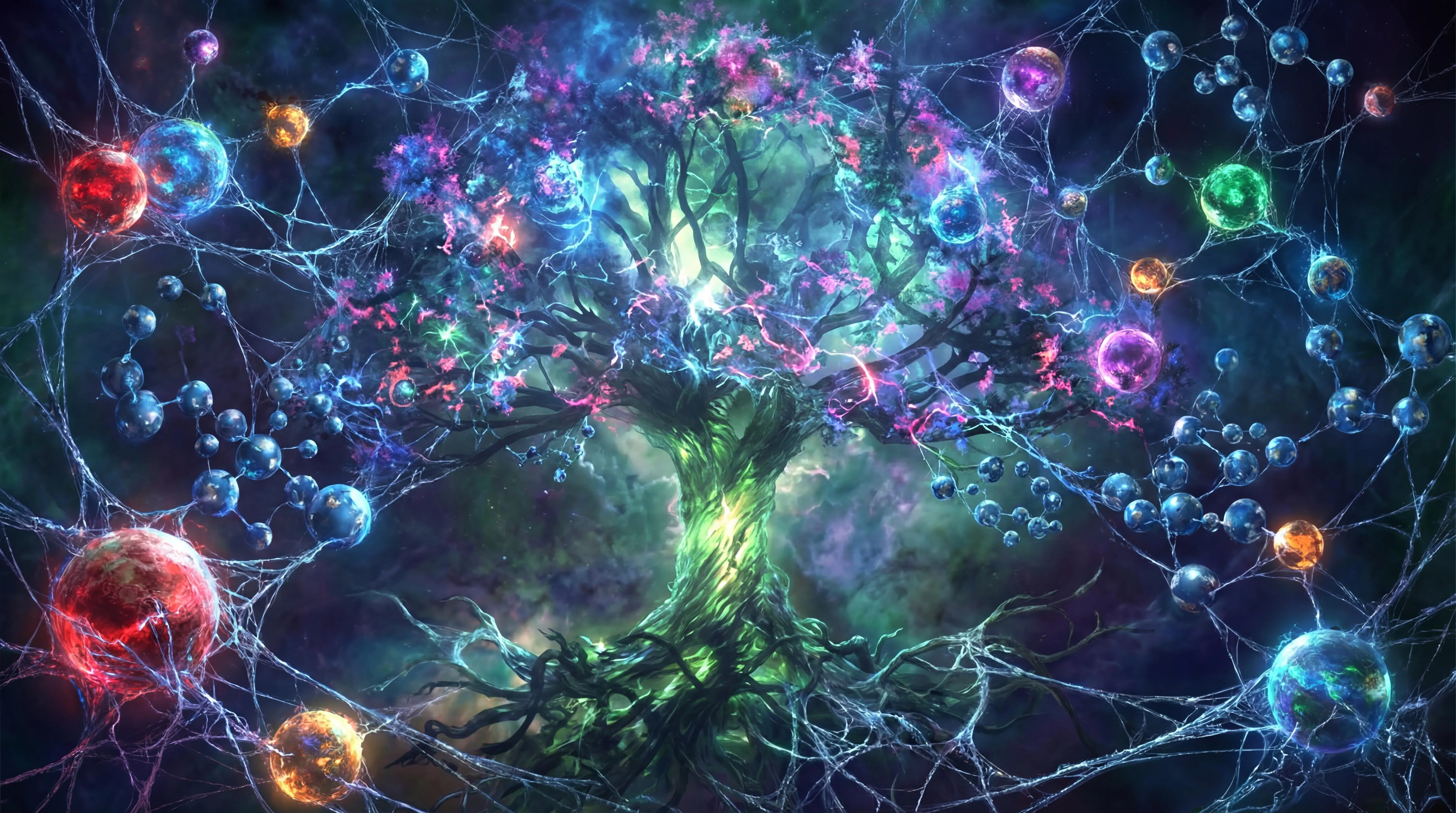 Explore AI-generated visuals merging Marvel, DC, Arrowverse, and Spider-Verse multiverses. See SSU's webs entwine with MCU's branches, Arrowverse's spheres fuse with DCEU's orbs. Create stunning multicolored, web-tree branched dimensional concepts. Generate this iconic cosmic convergence using AI art tools. No people. (47 words)