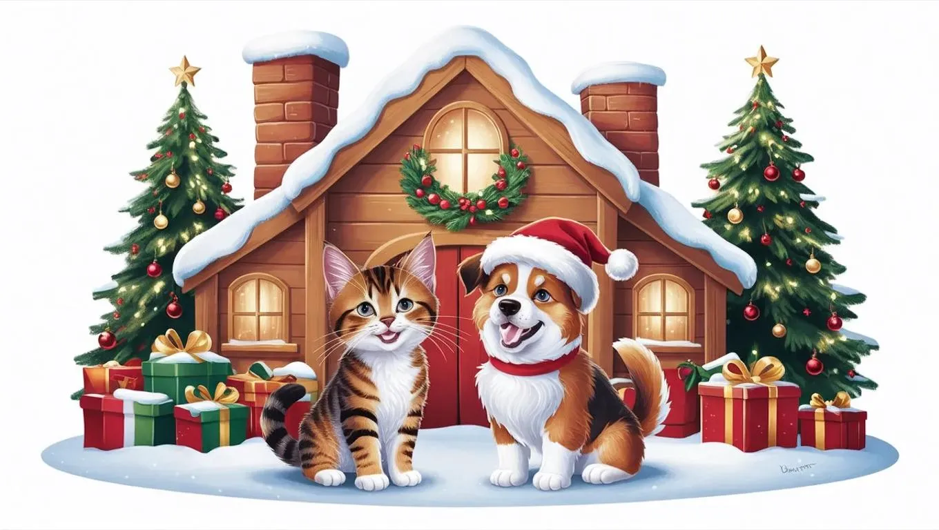 Generate adorable AI stickers of a cute cat and dog at Santa's Workshop with vivago.ai. Vintage-inspired vector art featuring muted colors, clean contours, and intricate details on a white background. Perfect for festive designs—explore AI-powered image generation for whimsical, ecstatic holiday visuals.