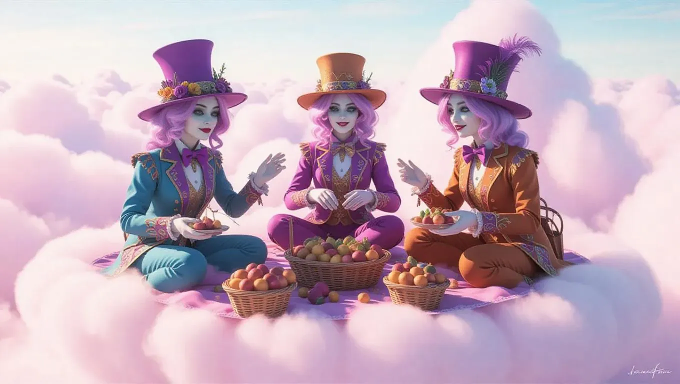Floating serenely amidst cotton-candy clouds, a trio of eccentric beings, adorned with intricately designed hats and mismatched attire, are arranging a lavish picnic on a wispy, iridescent mist-platform, surrounded by levitating wicker baskets overflowing with exotic fruits and delicacies, as a faint, shimmering aura radiates from their whimsical gathering, bathed in soft, ethereal light, with the faintest wisps of cirrus clouds wisping across the edges of the frame, in a breathtaking, hyper-realistic, dreamlike scene, reminiscent of a whimsical surrealist painting.